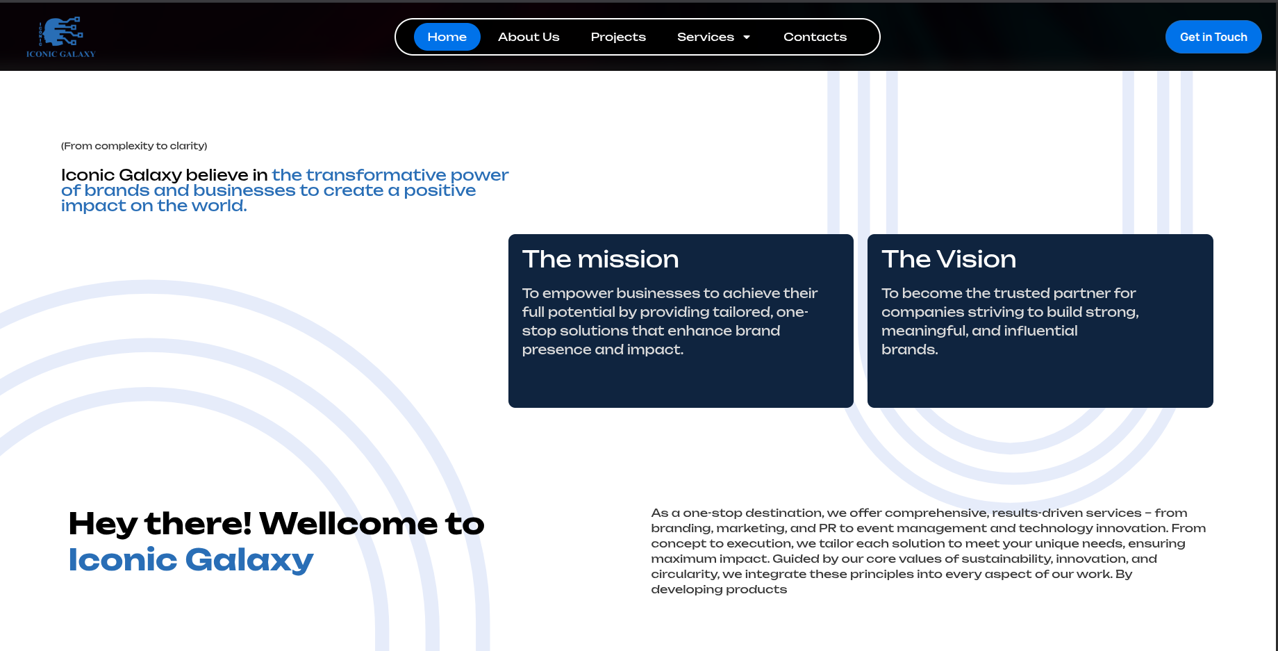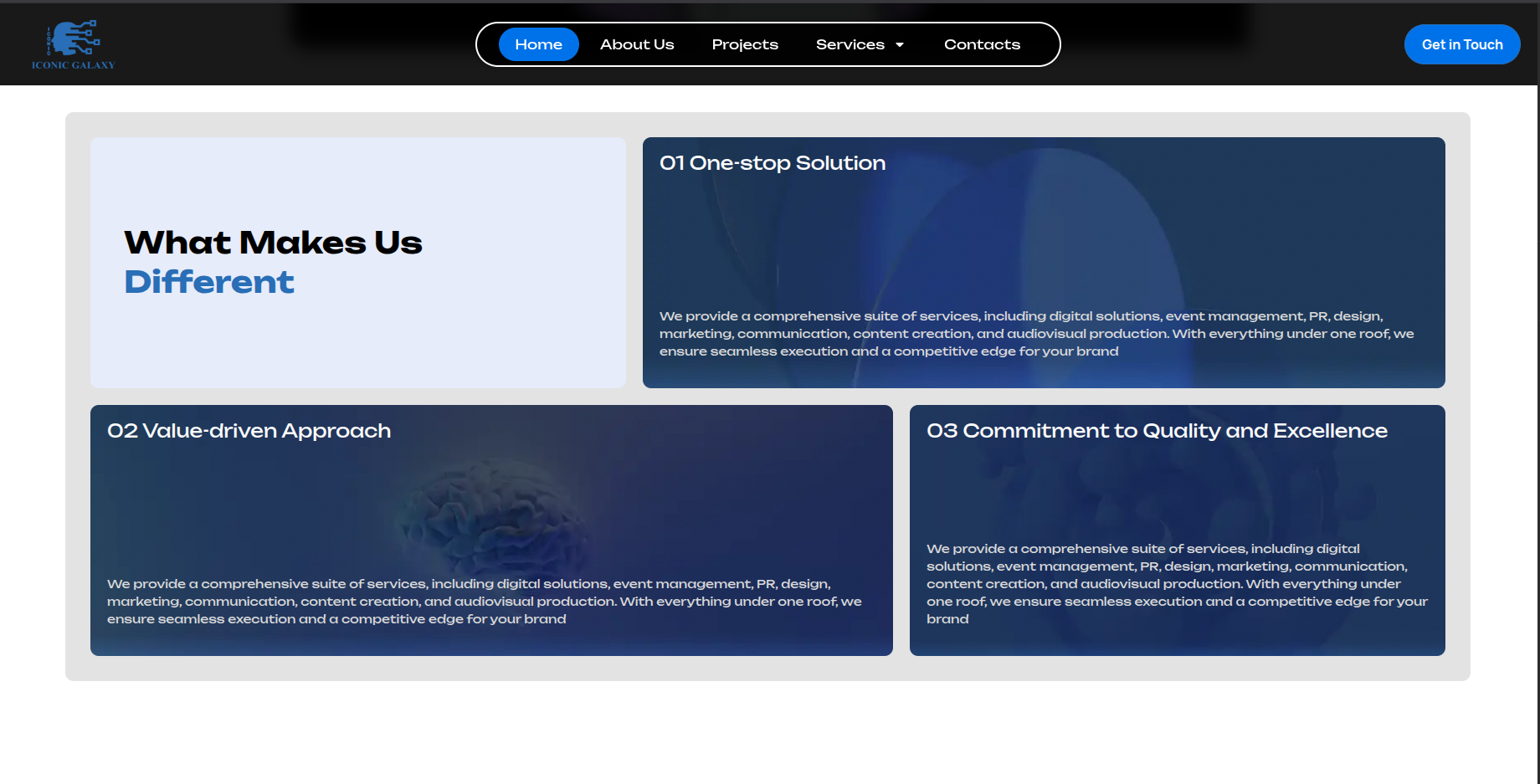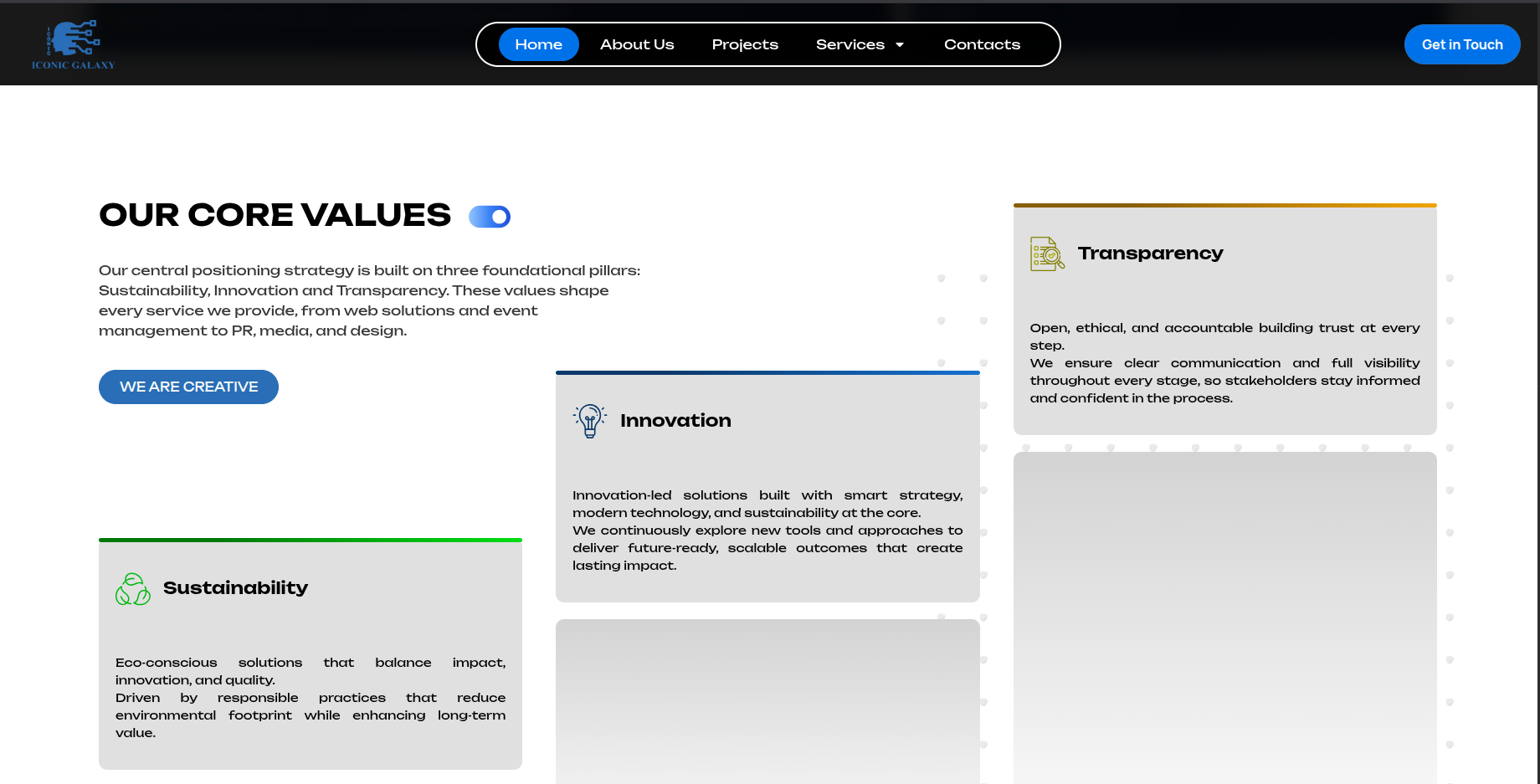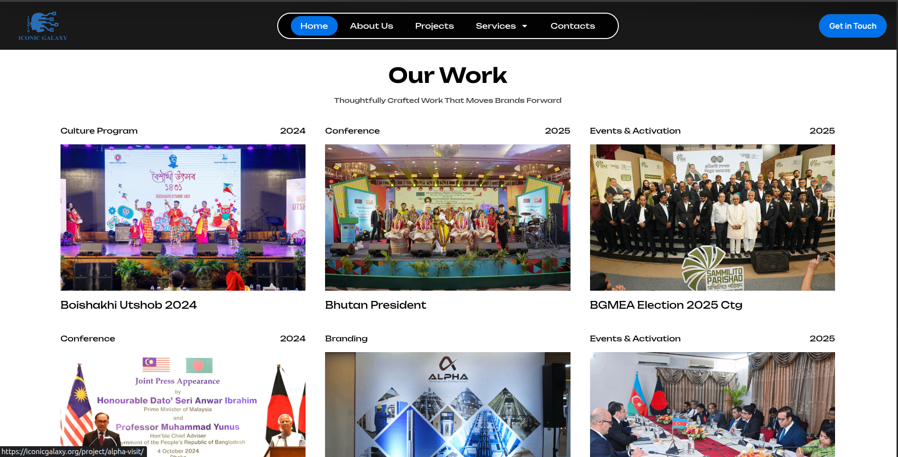 Iconic Galaxy is a full-service creative and marketing agency offering end-to-end solutions including branding, marketing, PR, event management, content creation, and web development. The platform presents the company as a one-stop destination for businesses seeking integrated, results-driven corporate solutions.